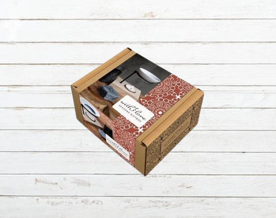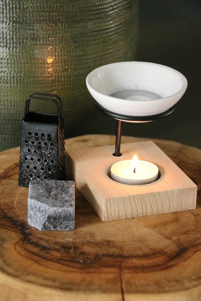 De giftbox meet 10x8x8 cm en heeft een elegante zwarte uitstraling, met een combinatie van keramieken stenen, een blokje was en een metalen rasp.