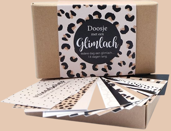 Positieve woorden geven positieve gedachten, positieve energie, een blij gevoel. Een paar mooie woorden zijn soms al genoeg om een groots gevoel te krijgen. Een glimlach op je gezicht te toveren. Daarom dit doosje, een ‘Doosje met een Glimlach’. Een mooi bewaardoosje met 14 ‘goed gevoel’ kaartjes. 14 mooie kaartjes om twee weken lang, iedere dag te beginnen met een positieve start. Be happy!