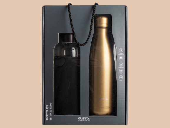 GUSTA LUXE GIFTSET Isoleerfles en Drinkfles 500ml. Goud / Zwart